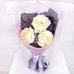 Роза белая - 3 шт., зелень декоративная (лимониум фиолетовый – 1 шт.), упаковка, лента.